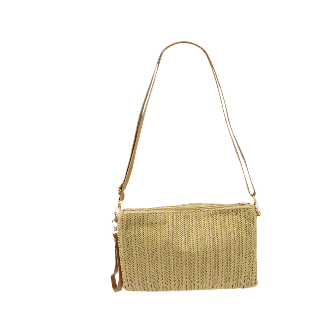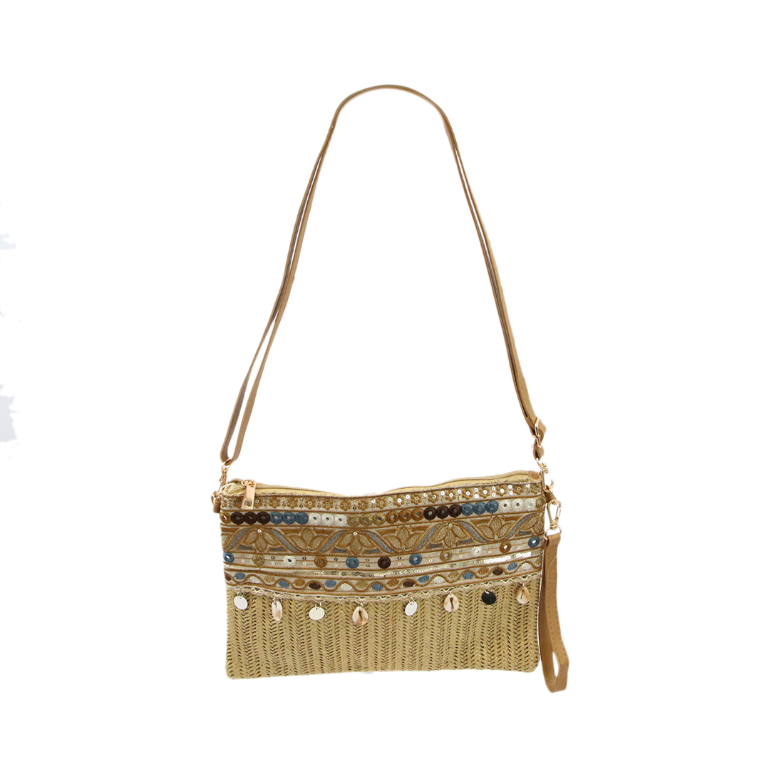 Clutch bag with woven straw base, embroidered panel and shell embellishment detail for casual use.