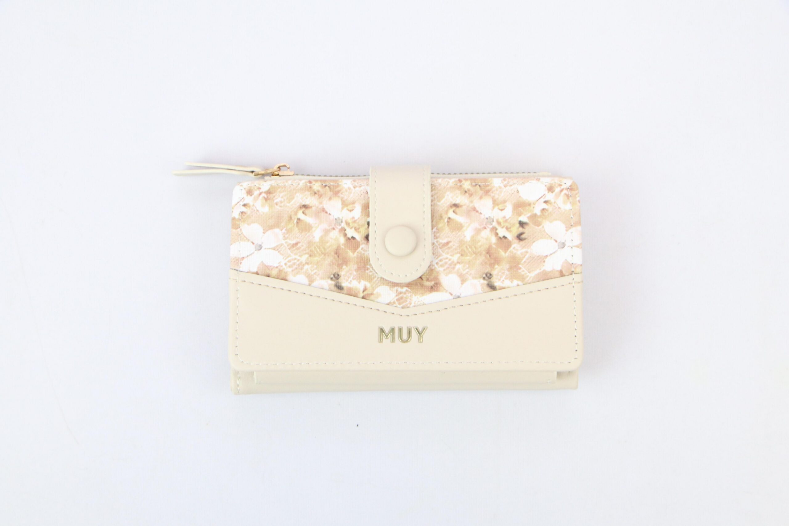 Floral pattern flap wallet with snap button closure and zip coin pocket.