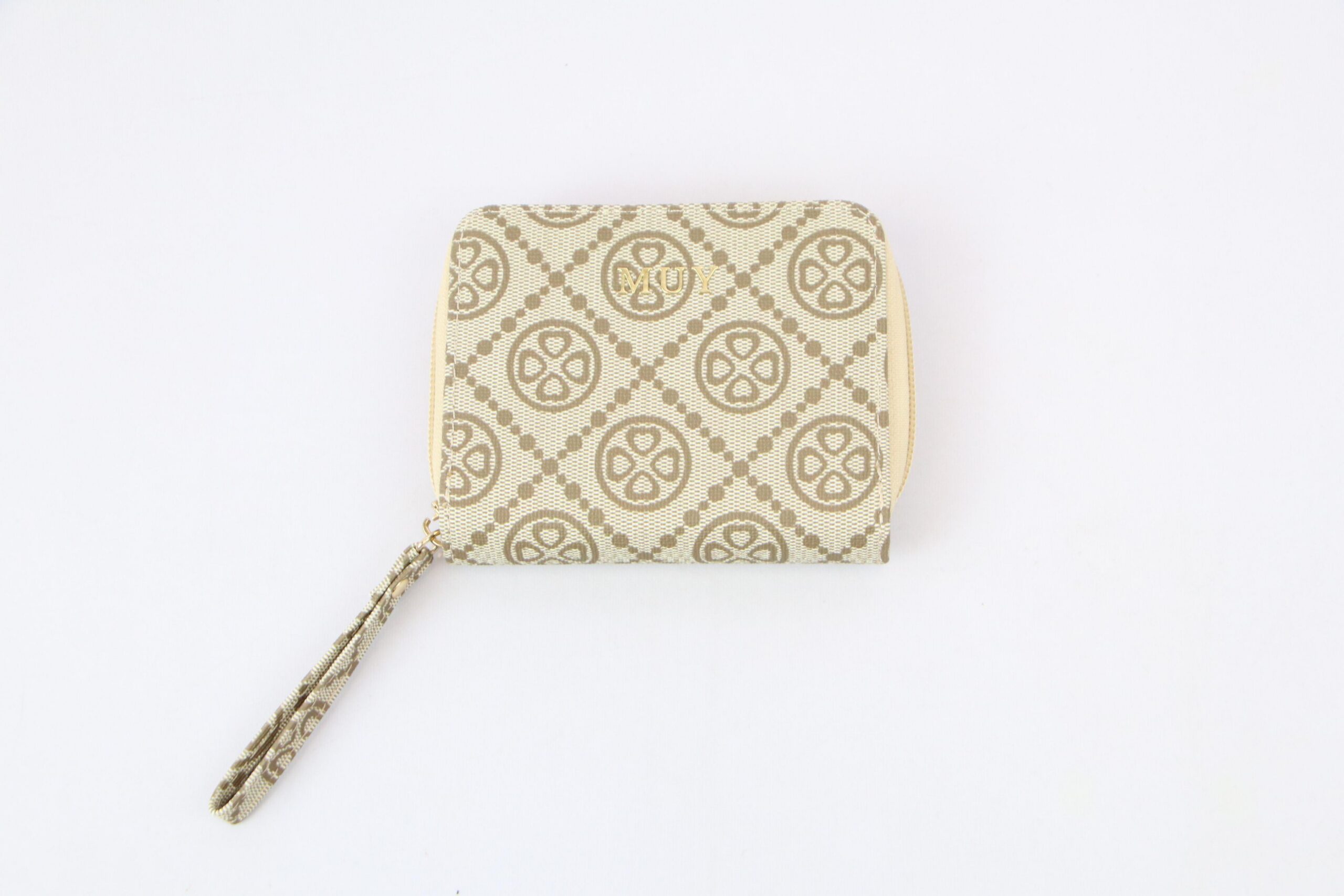 Patterned zip around compact wallet with multiple card slots and coin pocket.