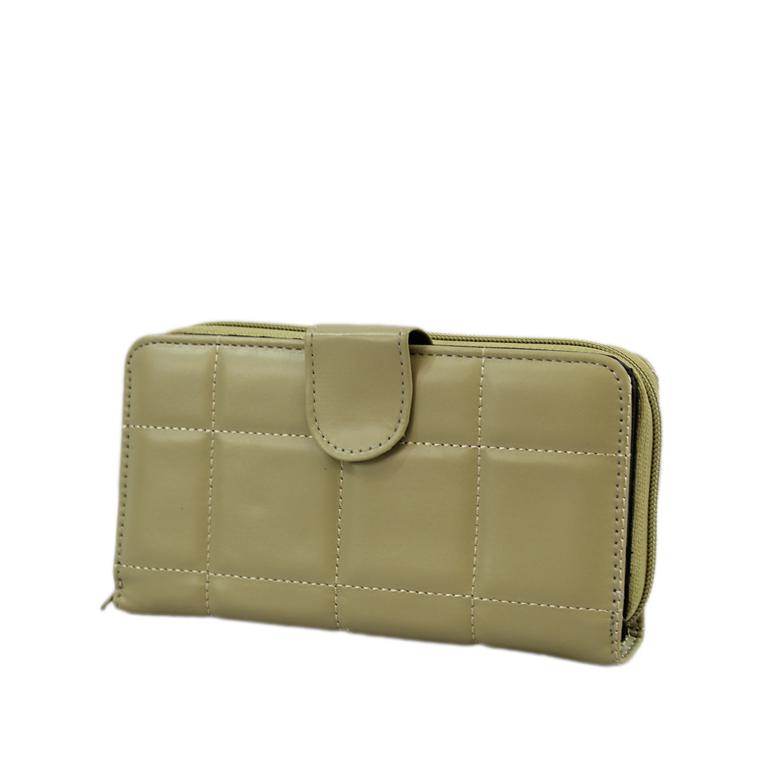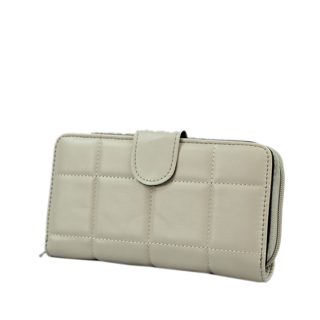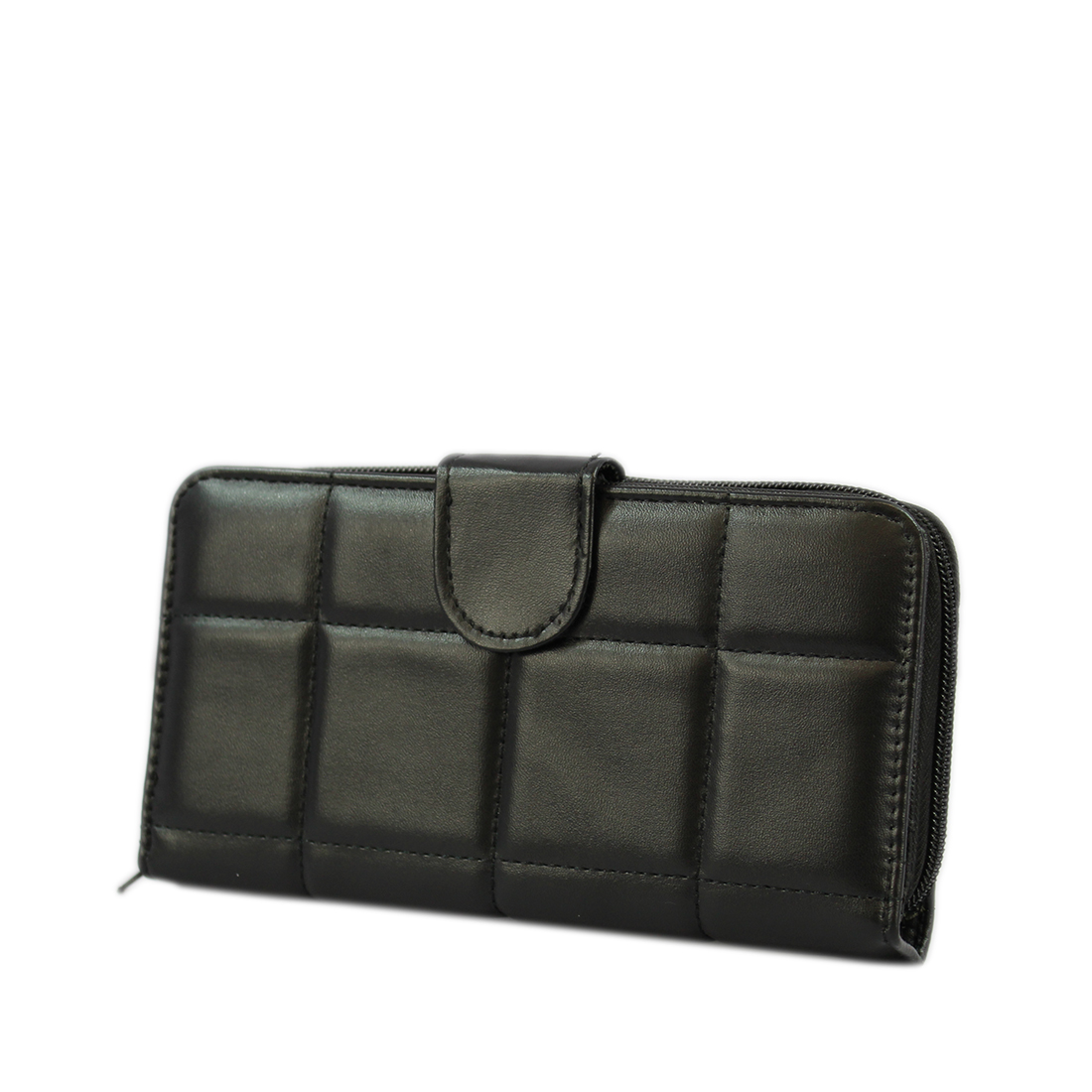 A long wallet with a front flap and snap closure.