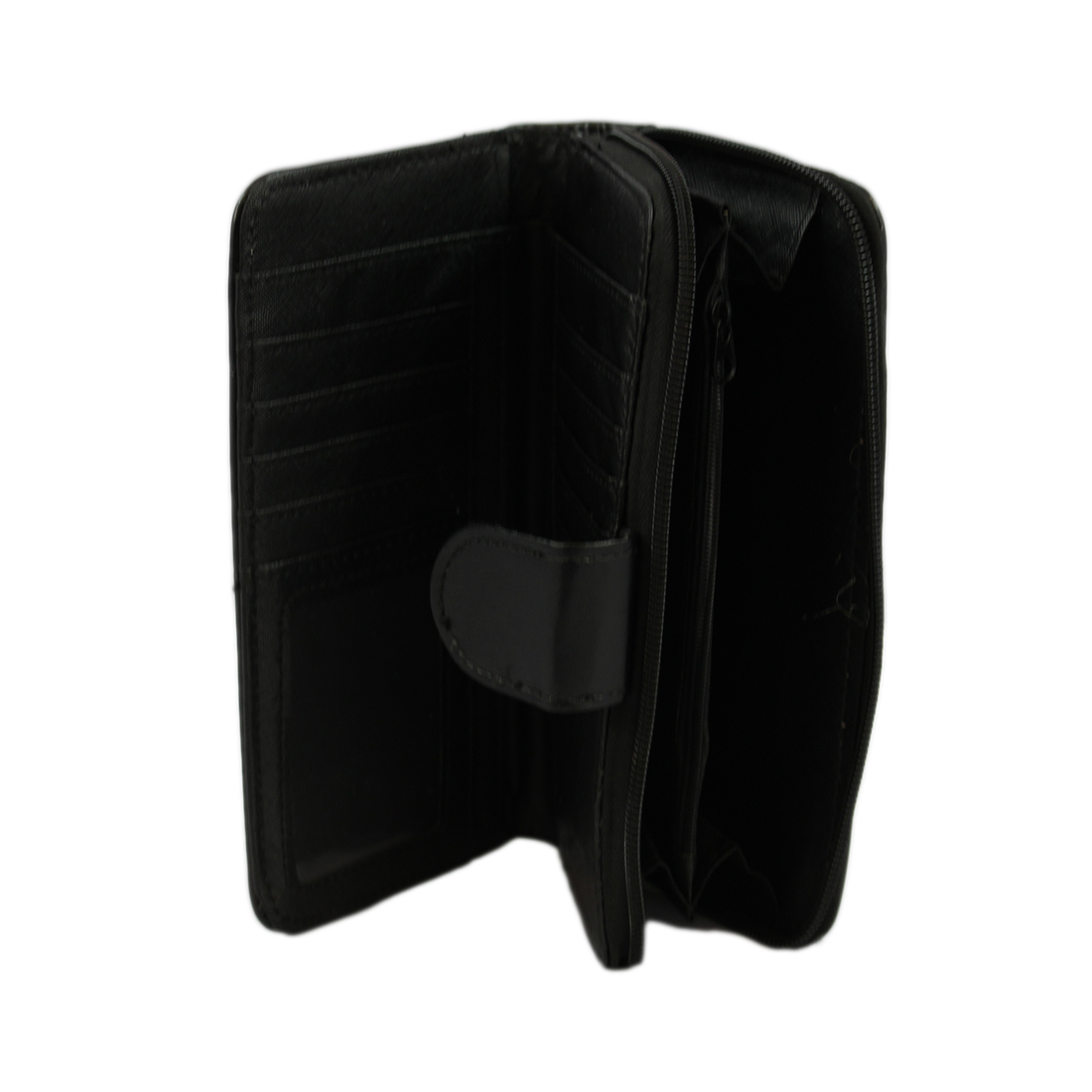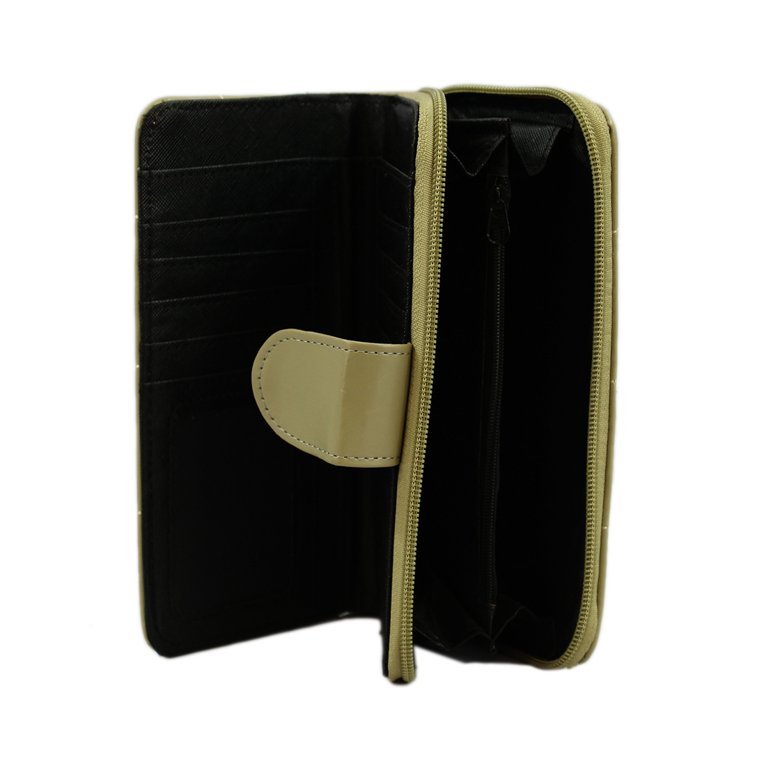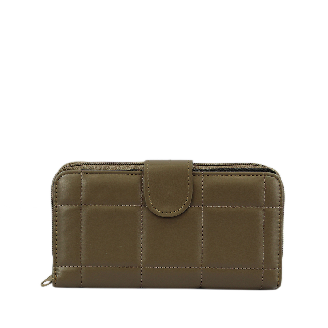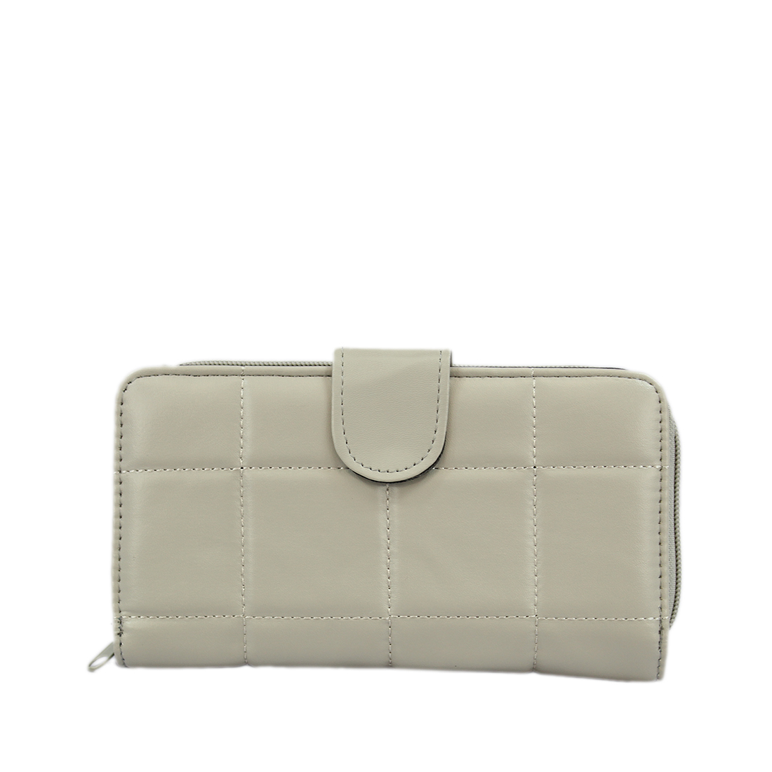 A long wallet with a front flap and snap closure.
