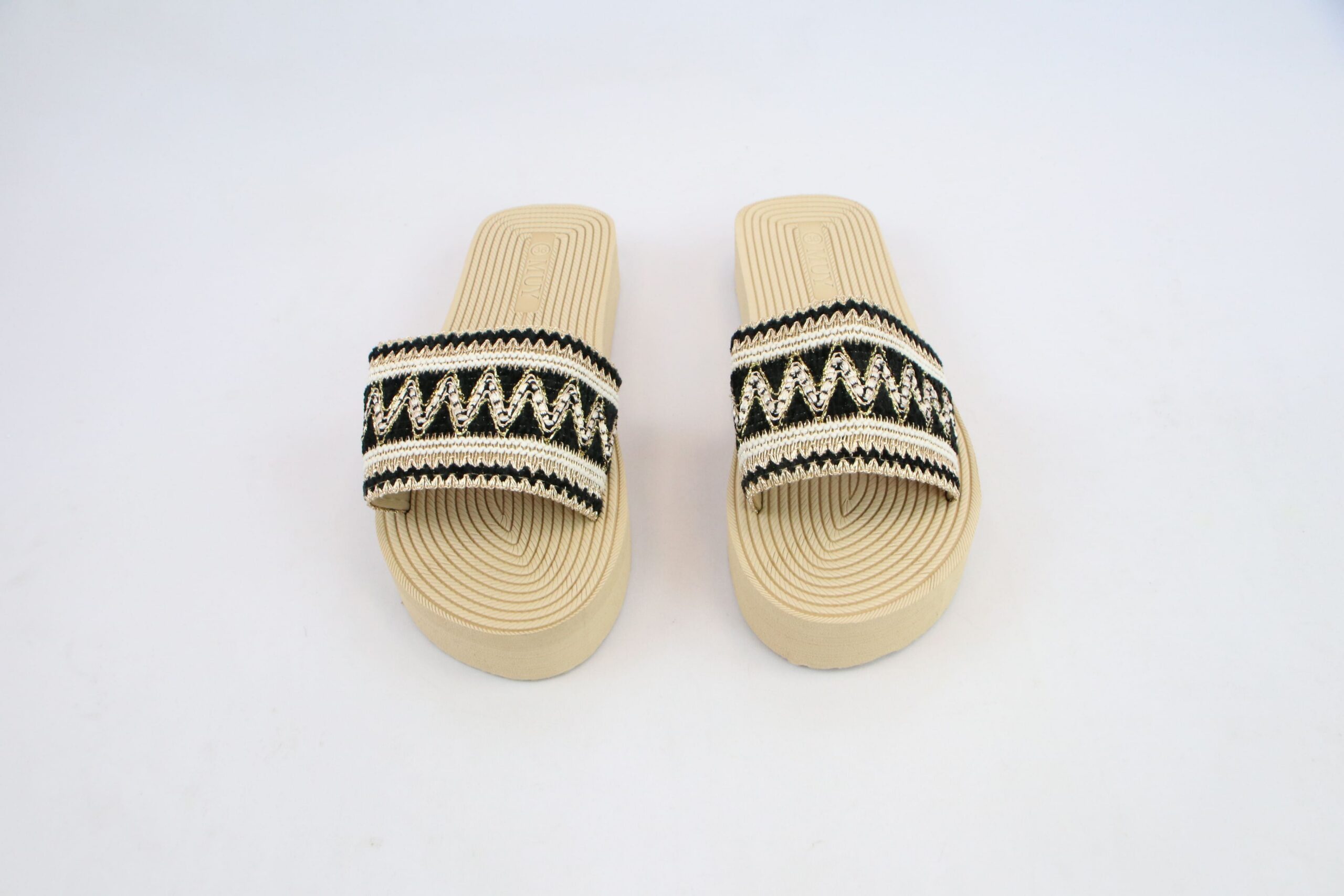 Flat slide sandals with woven strap detailing and decorative trim design.