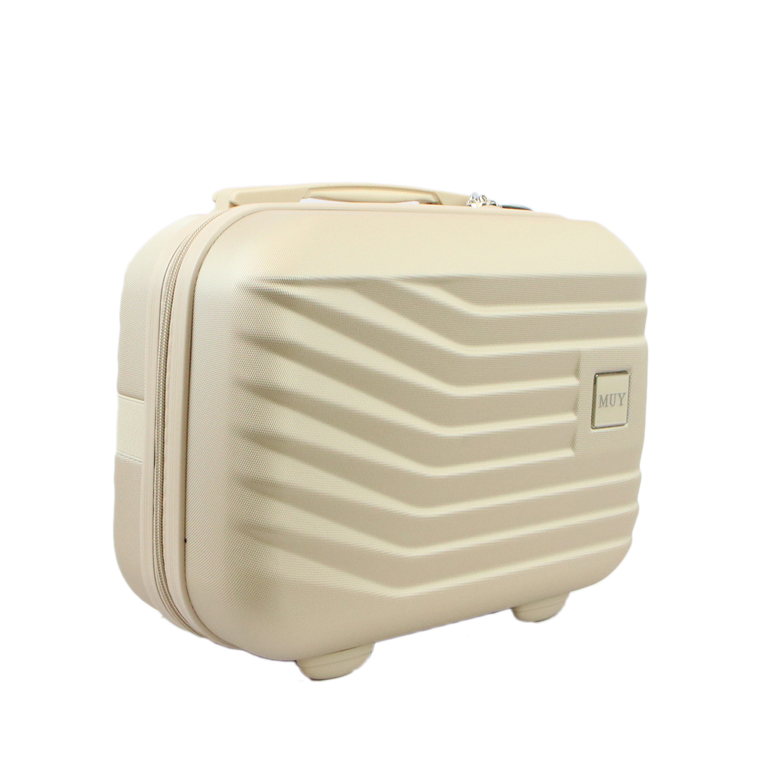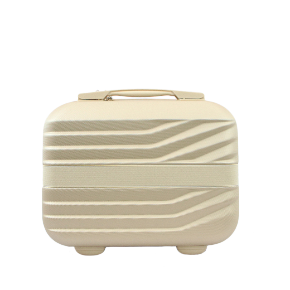 Hard shell vanity case with ribbed design and top handle for organized travel storage.