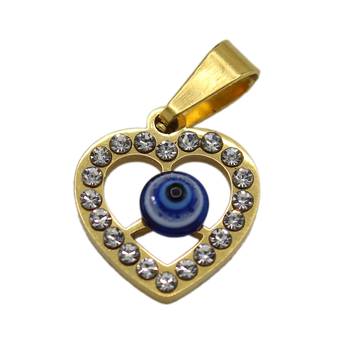 steel heart pendant with clear stones and a blue evil eye bead
