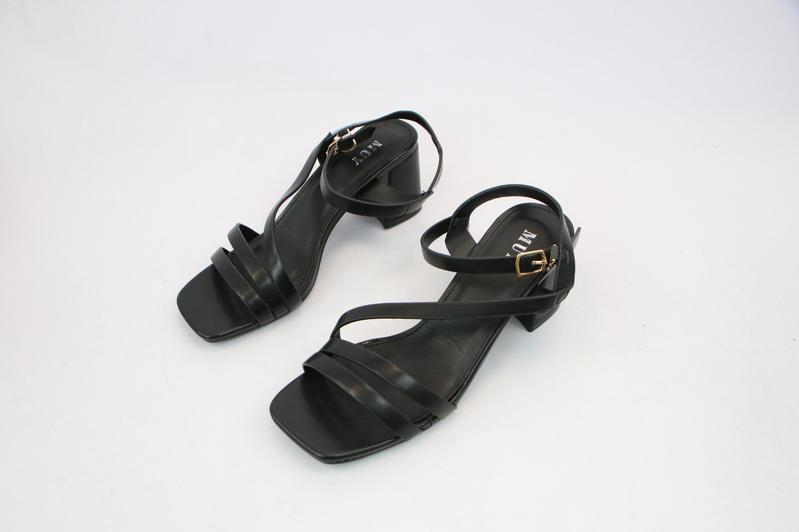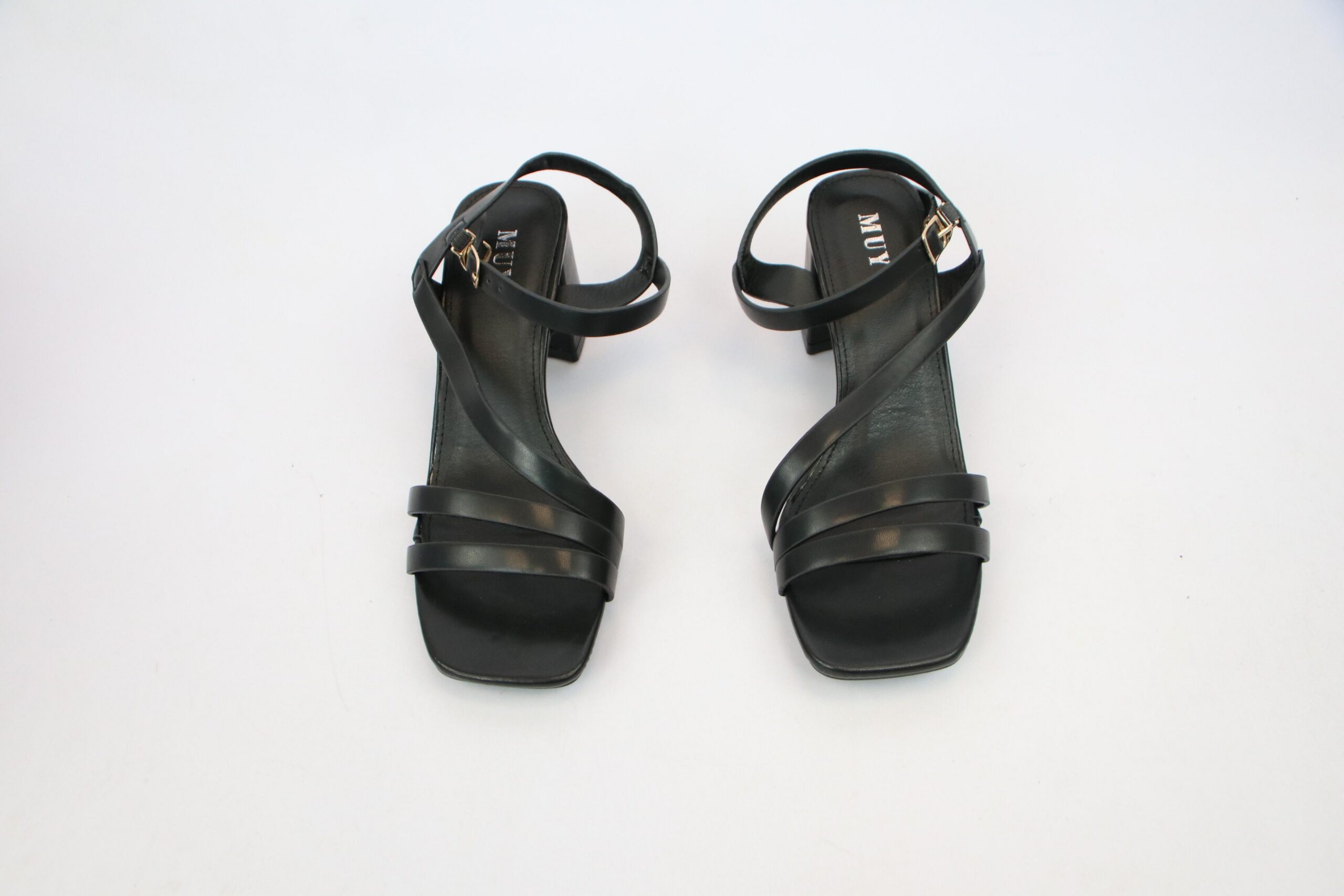 Open toe heel sandals with multi strap design and square toe style.