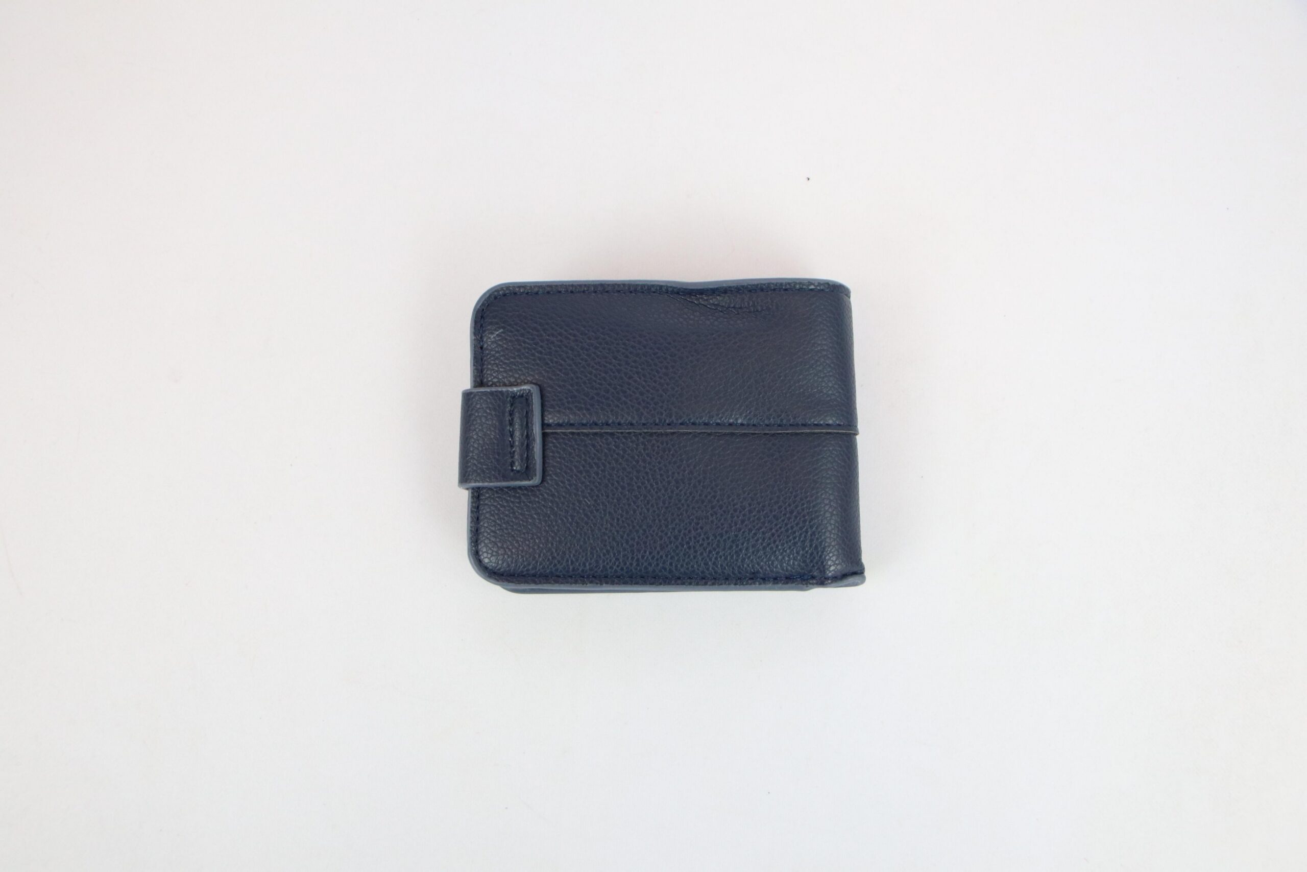 Textured bifold wallet with snap button tab closure and stitched panel detail.